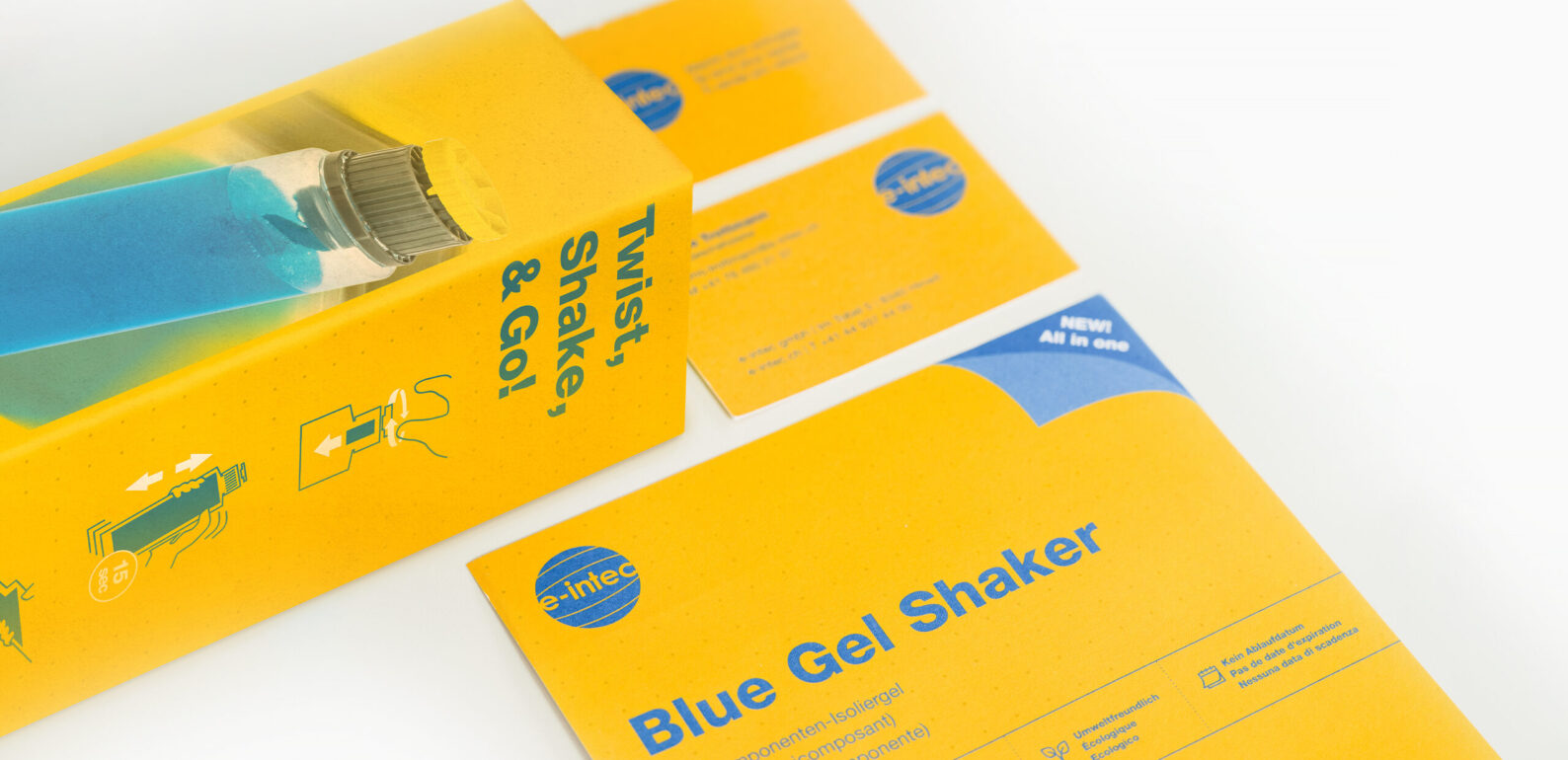 Ein umfassender Refresh der Markenidentität, bitte. Aber gerne doch! Das neue Corporate Design für Visitenkarten, Flyer, Give-aways, Onlinewerbung sowie Packaging Design erhielt einen ordentlichen Facelift. Das Logo blieb auf Kundenwunsch unverändert. Alle Produkte wurden dreisprachig in Deutsch, Französisch und Italienisch umgesetzt. Eine ausgefuchste Feintypografie und Adleraugen waren daher im gesamten Prozess wichtige Tools. Den Wunsch nach einer flotten, frischen Markenidentität, die den Auftritt des sympathischen Unternehmens unterstützt, konnten wir erfüllen – samt prominentem neuen Look fürs innovative Produkt von E-intec, den Blue Gel Shaker.