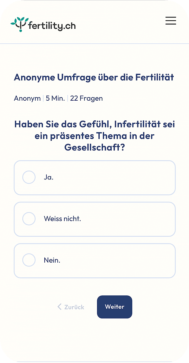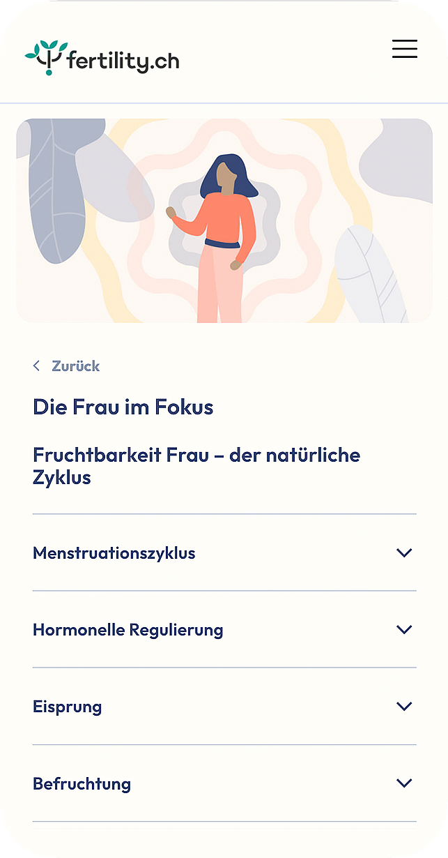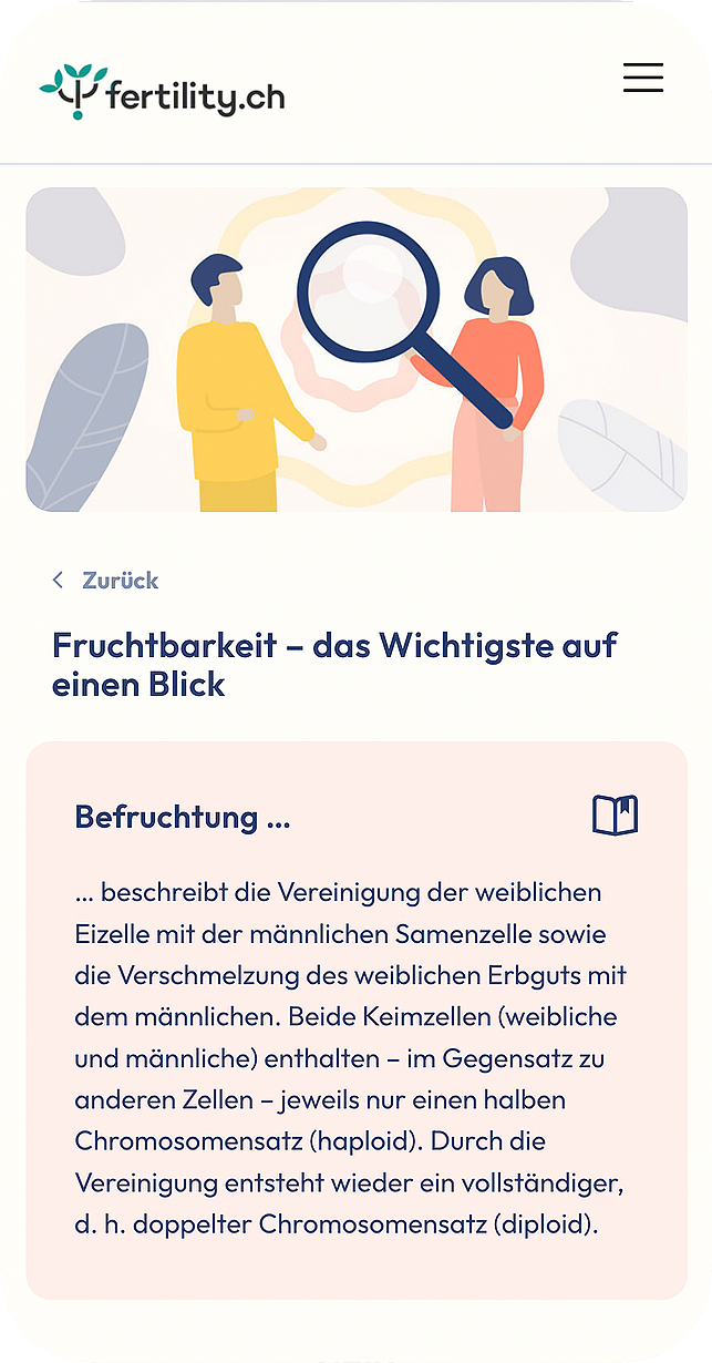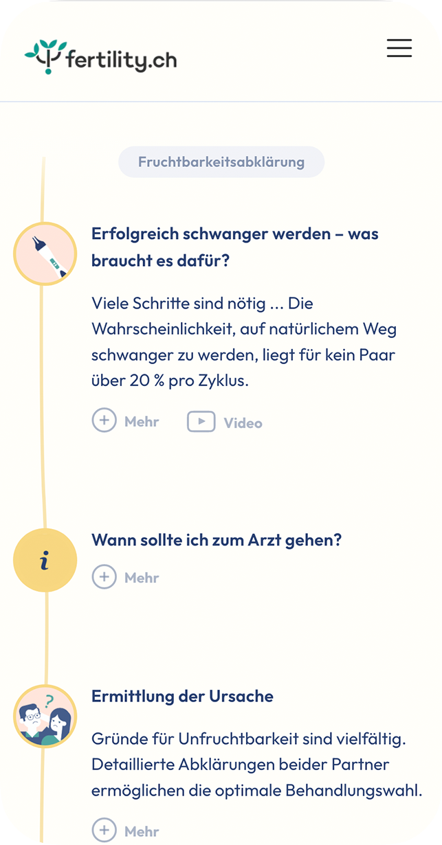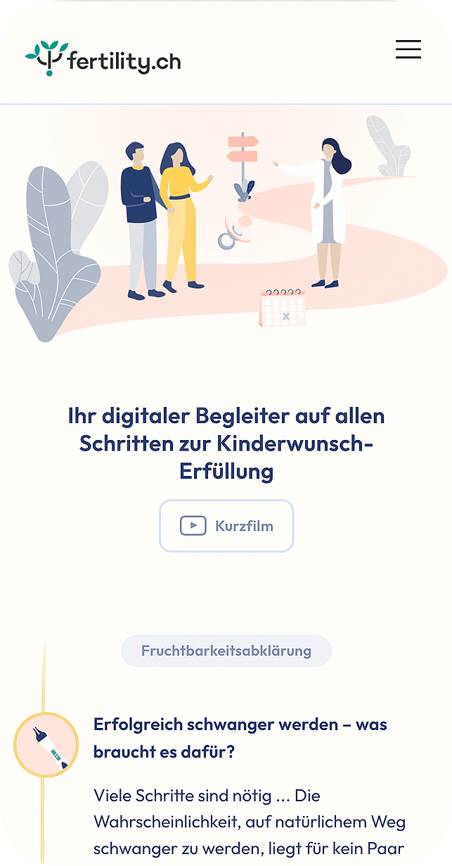fertility.ch ist die neue Kinderwunsch-Plattform. Paare mit unerfülltem Kinderwunsch finden hier niederschwellig, diskret und unkompliziert alle wichtigen Informationen von A bis Z, vom Kinderwunsch bis zur Schwangerschaft. Das Angebot ist anonym und ohne Anmeldung nutzbar, da Infertilität noch immer ein sensibles Thema in unserer Gesellschaft darstellt. Die Website wird zum ganzheitlichen, digitalen Begleiter und hilft ohne grosse Hürden den Erstkontakt zu wichtigen Anlaufstellen und Beratungsstellen zu knüpfen.