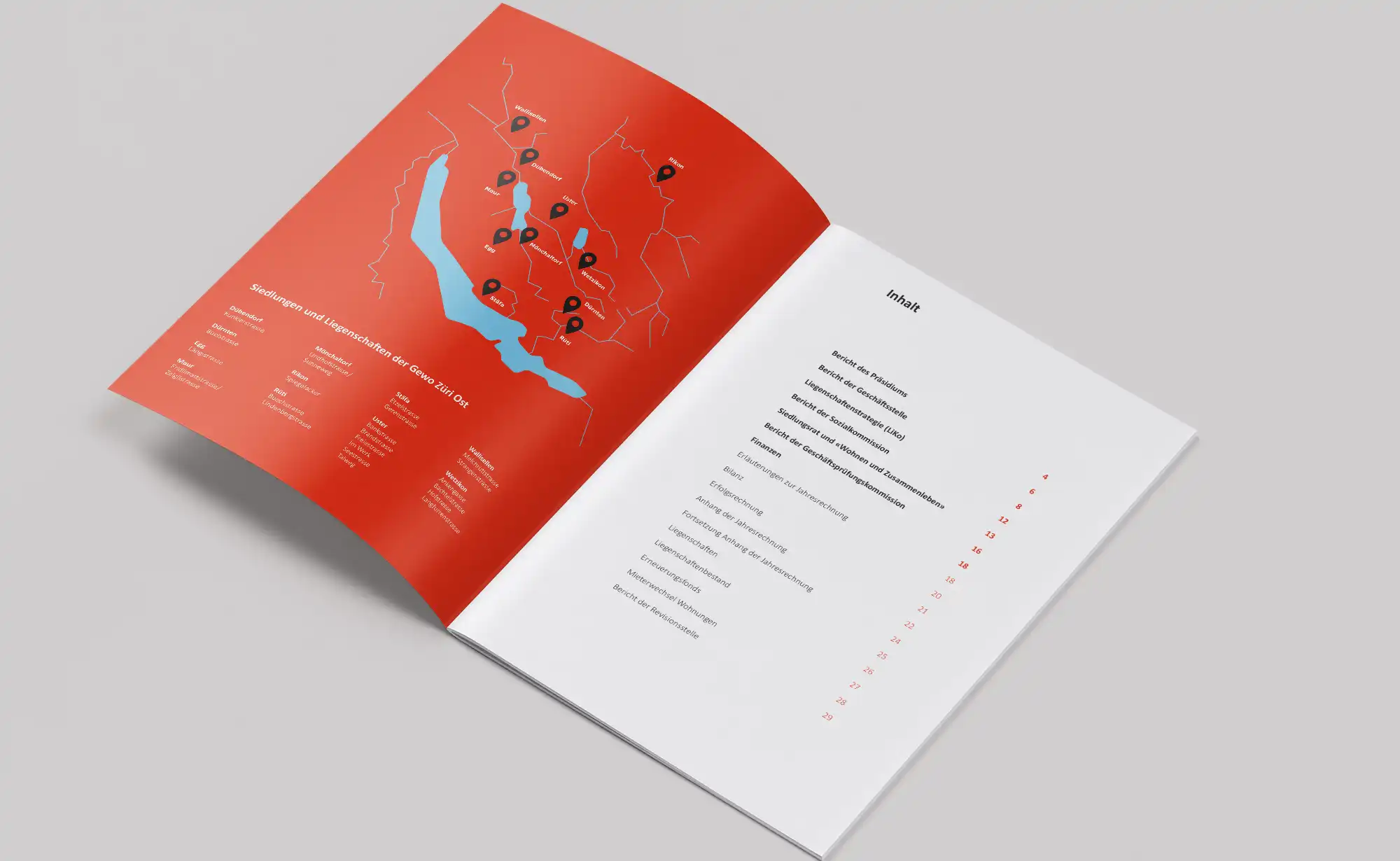 Vertrauen, Gemeinschaft und Verantwortung – diese Werte stehen bei der Gewo Züri Ost im Zentrum. Genau das spiegelt auch der neue Geschäftsbericht wider. Besonderen Wert wurde auf eine grosszügige Typografie und klare Strukturen gelegt. Zusätzlich sorgen Designelemente wie die roten Infoboxen für Orientierung, ohne sich aufzudrängen.