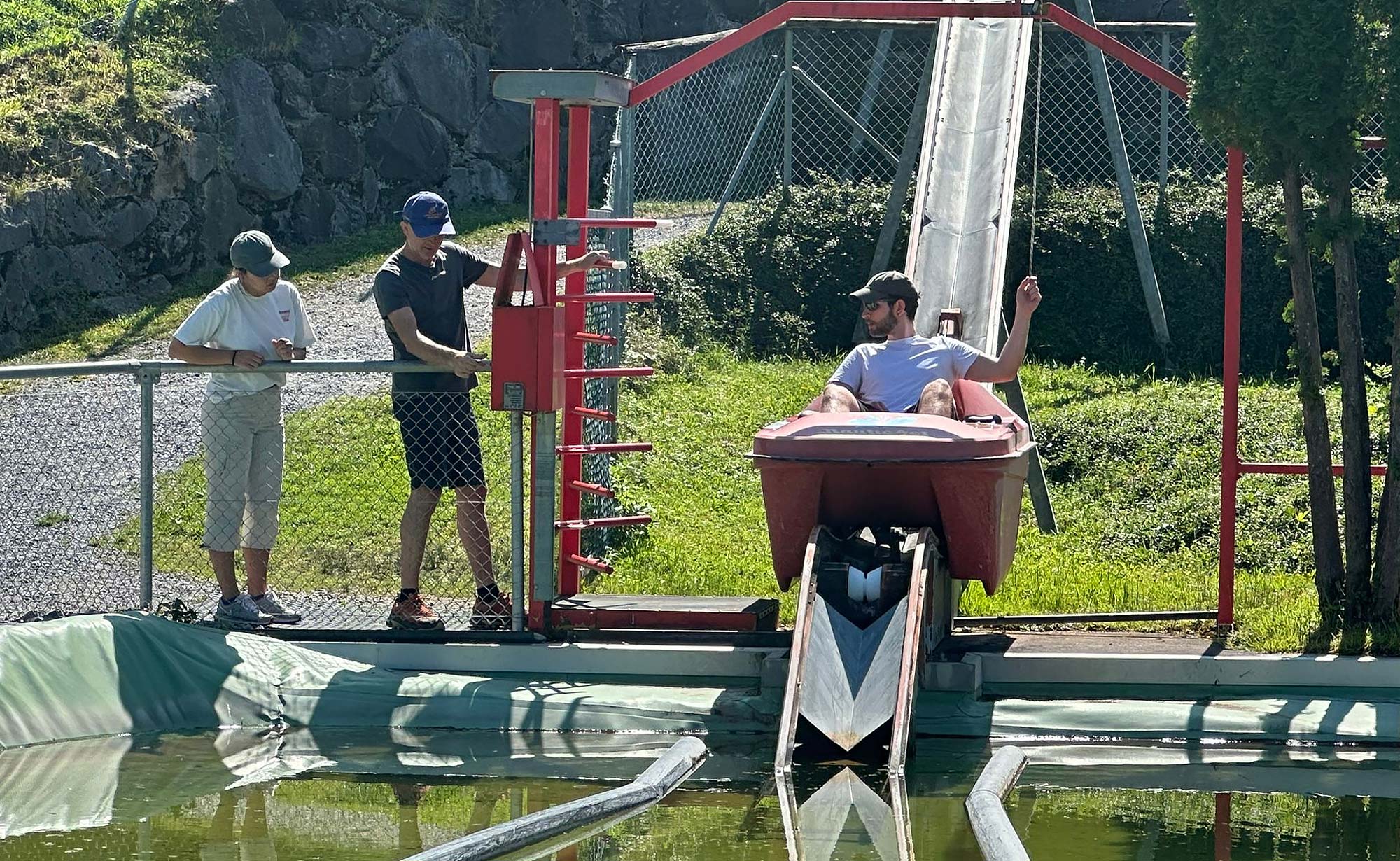 Mit textilen Beschleunigern (wie nennt man die eigentlich?) stürzte man sich in die teils abenteuerlich steilen Röhrenrutschen. Die Einen fuhren laut kreischend gleich mehrfach die senkrechte «Todes»-Rutsche. Die Anderen gingen es gemütlicher an. Bis unsere Aufmerksamkeit bald von ganz herzigen Bergbewohnern angezogen wurde: den Ziegen. Beinahe hätte unser Büro Zuwachs erhalten, der Geruch des Ziegenbocks hat uns aber schnell wieder zur Vernunft gebracht. So blieb es nur bei therapeutisch wertvollen Streicheleinheiten.
