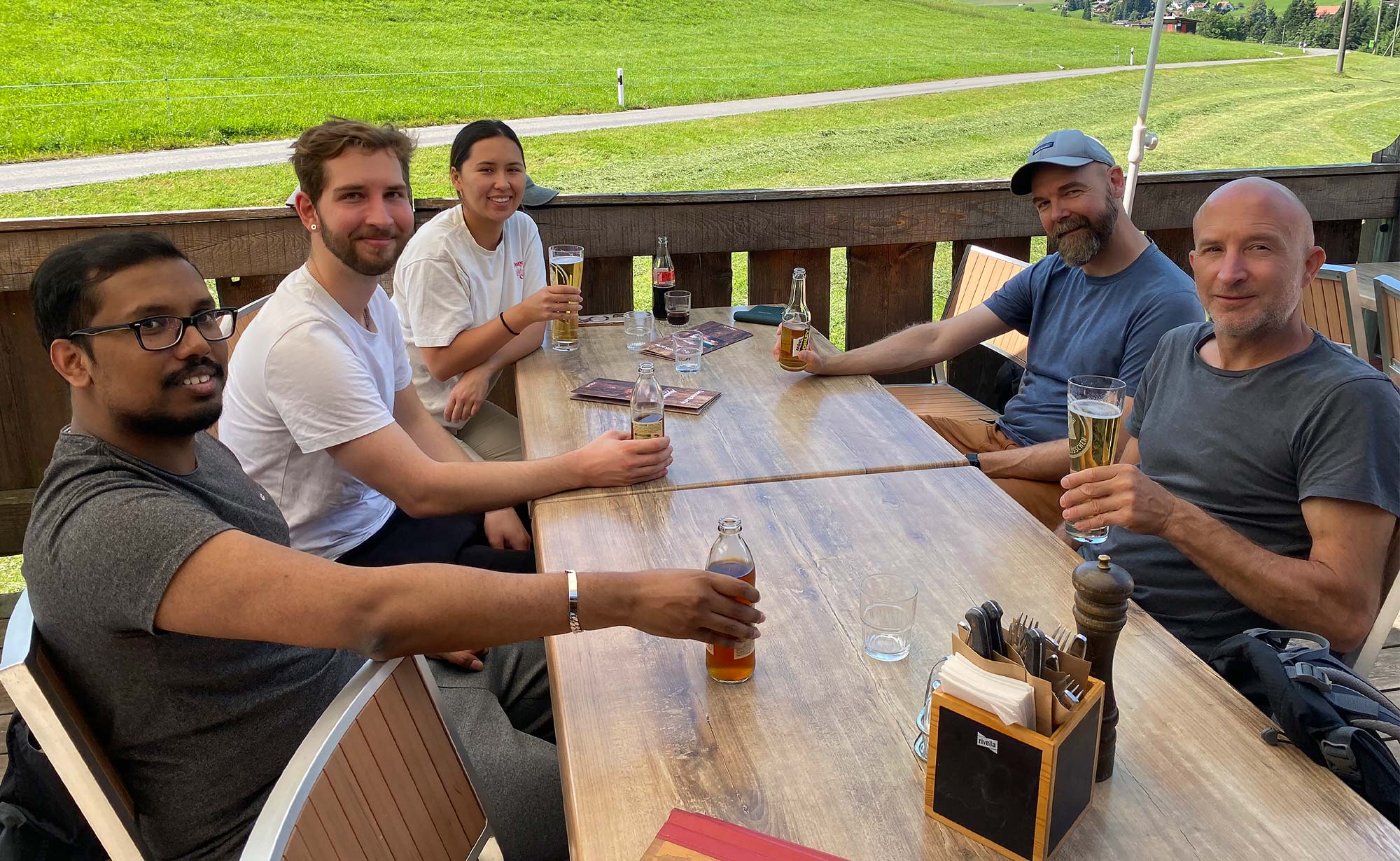 Gemütlicher Zmittag mit Ausblick, danach das eigentliche Tages-Highlight: der Seilpark. Nach kurzer Einführung zogen wir in zwei Teams los. Desi, Shanu und Kerstin starteten mit einer einfachen Route (erst mal langsam herantasten). Während Martin, Jörg und Nico gleich auf einer anspruchsvolleren Route loszogen. Inklusive Tarzan-Jump aus 13 Metern Höhe. Jeder hat sich aus seiner persönlichen Komfortzone heraus bewegt. Zuletzt sind Jörg und Martin todesmutig auf Parcours Nummer sieben mit dem passenden Namen «Diavolezza». In 16 Metern Höhe über den Baumkronen haben die beiden alles gegeben. Während das restliche Team sich schon wieder über festen Boden unter den Füssen freute und ein paar Sonnenstrahlen tankte. Danach noch ein feines Glacé und kühle Drinks, so lässt sich so ein aufregender Tag entspannt ausklingen.